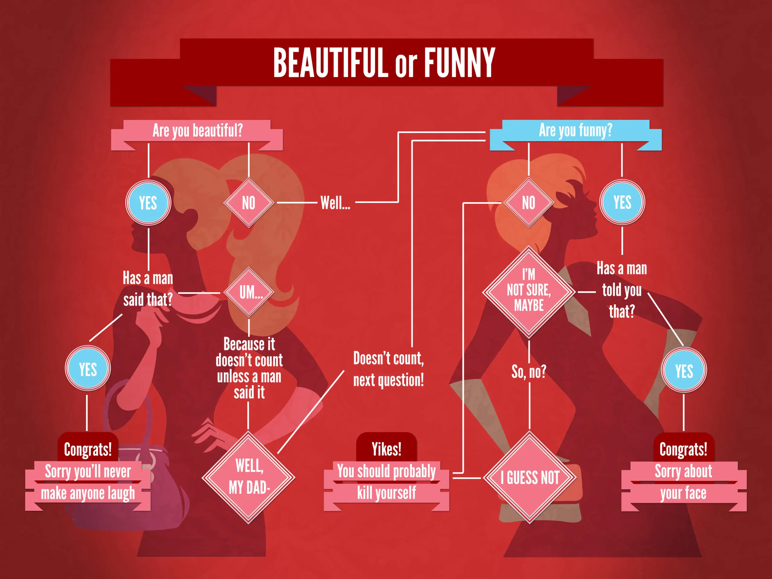 So ladies, if you’re having difficulty figuring out whether you’re funny or beautiful–since we all can’t ask Michael Eisner, He Who Deems the Aesthetic and Comedic Value of Women– here’s a flow chart to help you figure it out: