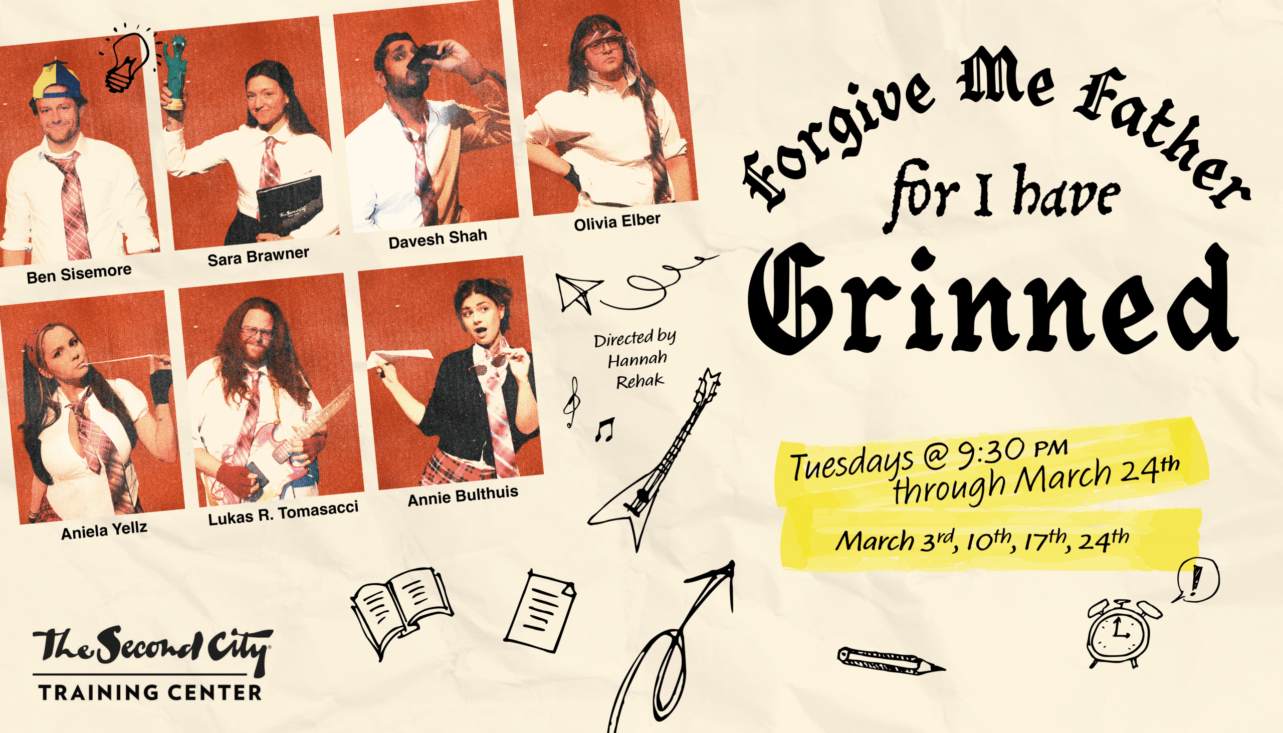 Join us as we joke about life’s big and small challenges in Forgive Me Father For I Have Grinned — a show that reflects 2026’s hardships through a funhouse mirror sure to make you laugh. Maybe you’re getting the ick from the person you’re dating, you’re waiting to hear your name in a rich relative’s will, or you’re committing insurance fraud because times are tight. In any case, we see you and you DESERVE to laugh and not cry. So put your hands together and ask for forgiveness because this sketch show is sure to make you grin at all the right (and wrong) things.
