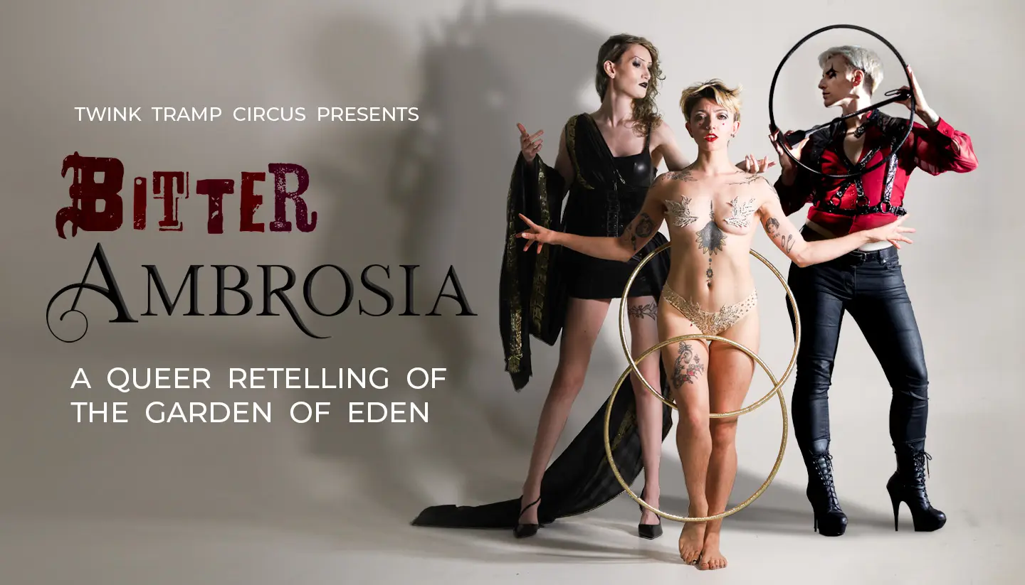 Bitter Ambrosia is a blasphemous retelling of the Garden of Eden that subverts the biblical narrative into one of queer acceptance and trans joy. This musical rendition shows the origins of the Snake, a fallen angel who journeys through Hell, making revelations about sin, piety, and gender expression along the way. Rather than vilifying the Snake for his seduction of Eve, Bitter Ambrosia commends him for attempting to save her from an ill-fated life of pious subservience. This original story celebrates different expressions of queerness and the trans experience, through boylesque, aerial lyra, circus hoops, live singing, and comedy.