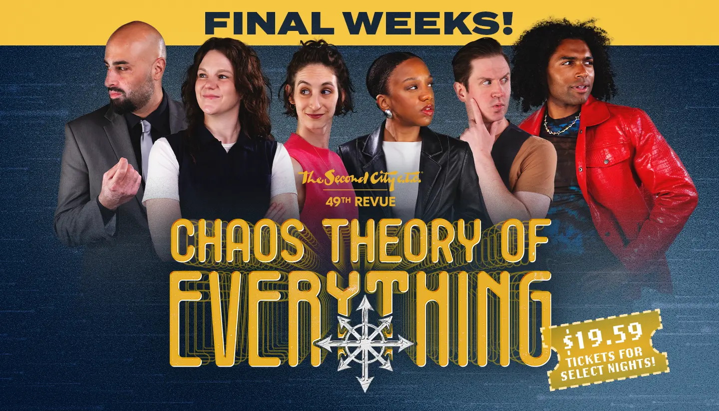 Strap in and spiral out – The Second City’s 49th e.t.c. Revue takes sketch and improv comedy to brilliantly unhinged new heights. The Chaos Theory of Everything blends razor-sharp satire, audience interaction, and clever, character-driven comedy to explore how wildly connected (and deeply chaotic) it all really is. Smart, hilarious, and full of surprises, this is one laughter-filled ride you won’t want to miss.